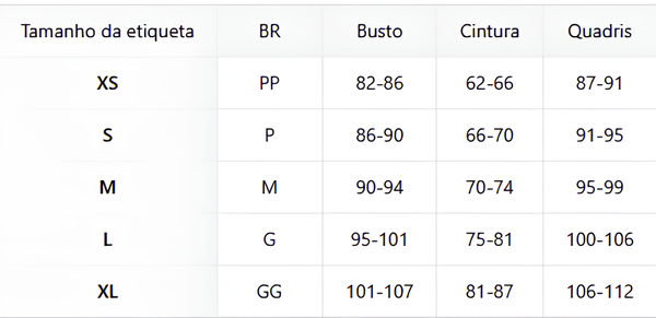 - M: Busto 90-94 • Cintura 70-74 • Quadril 95-99