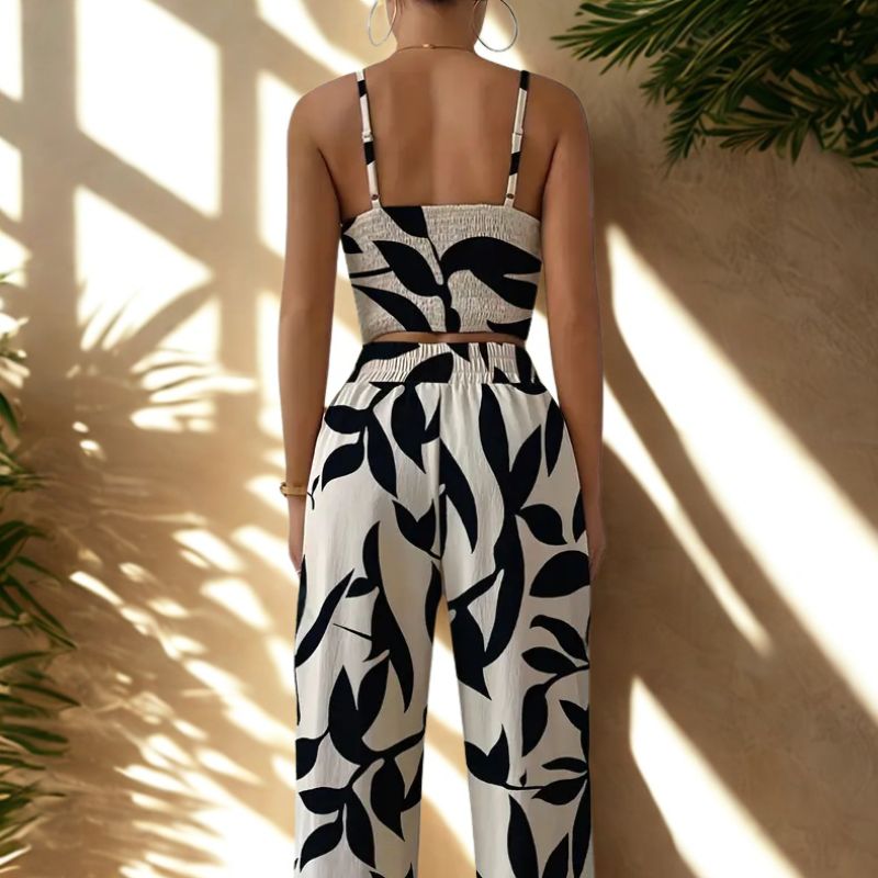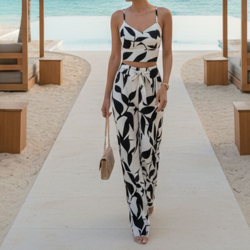 O conjunto feminino estampado preto e branco é a escolha perfeita para quem busca elegância, frescor e versatilidade em uma única peça. Composto por cropped de alças finas e calça pantalona de caimento leve, esse conjunto valoriza a silhueta e garante estilo para diferentes ocasiões, do casual chic ao mais refinado.