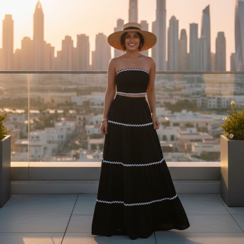 O conjunto feminino longo preto tomara que caia com detalhes brancos entrega sofisticação imediata e caimento impecável. A saia fluida alonga a silhueta, enquanto o top estruturado valoriza o busto e garante segurança. Uma peça-chave para viagens, festas e momentos especiais, unindo conforto premium e estilo atemporal que destaca você em qualquer cenário.